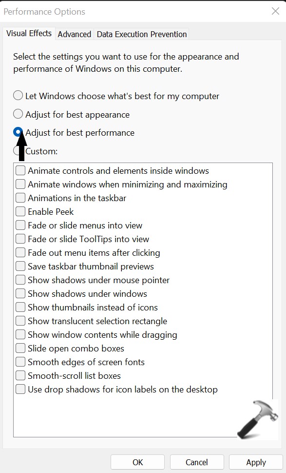 4. SeçinEn İyi Performansa AyarlamaaltındaGörsel efektler.