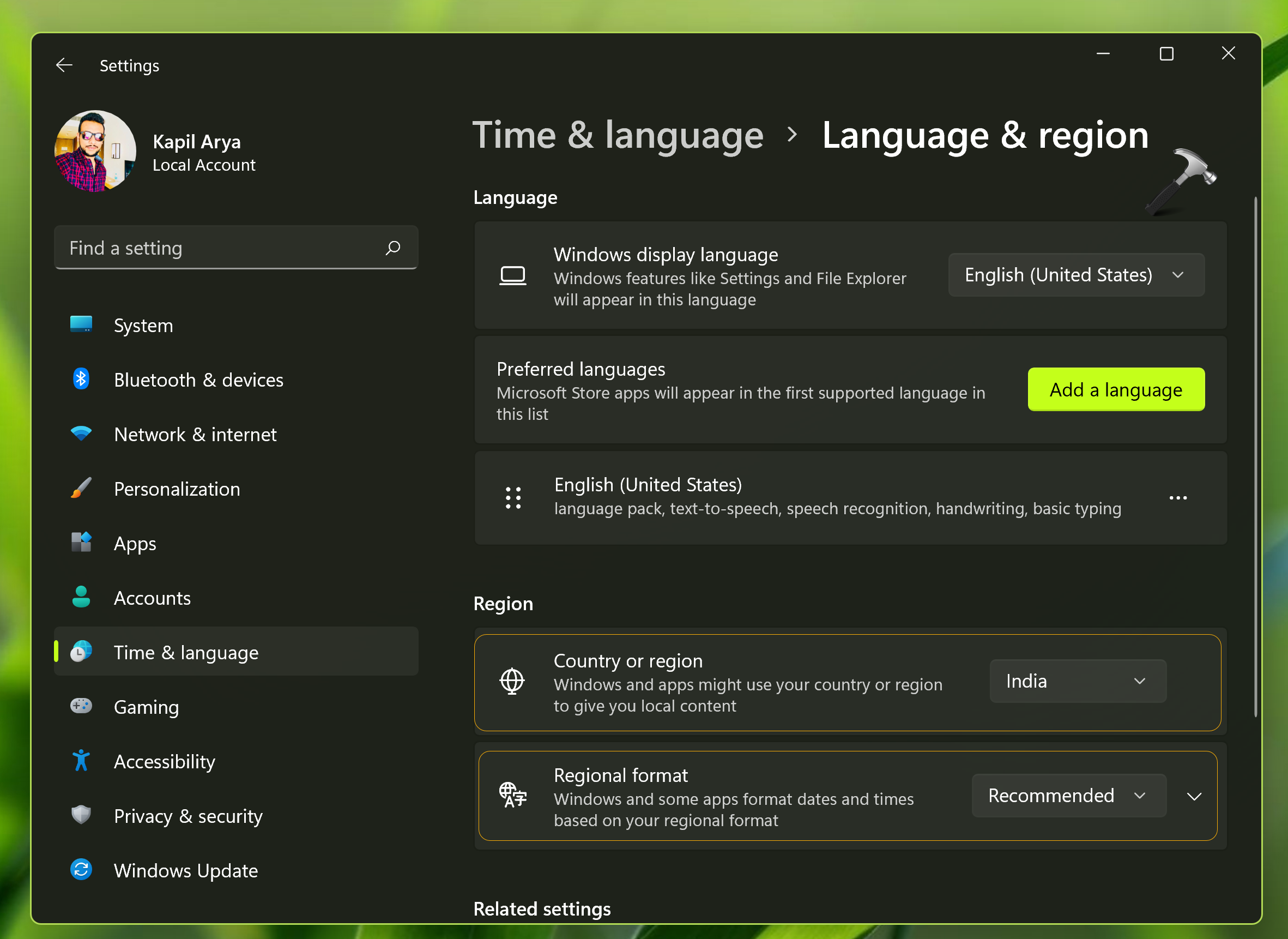 - Dil ve Bölge penceresinde, bölgeyi ve bölgesel format ayarlarını kontrol edin ve doğru olduklarından emin olun.