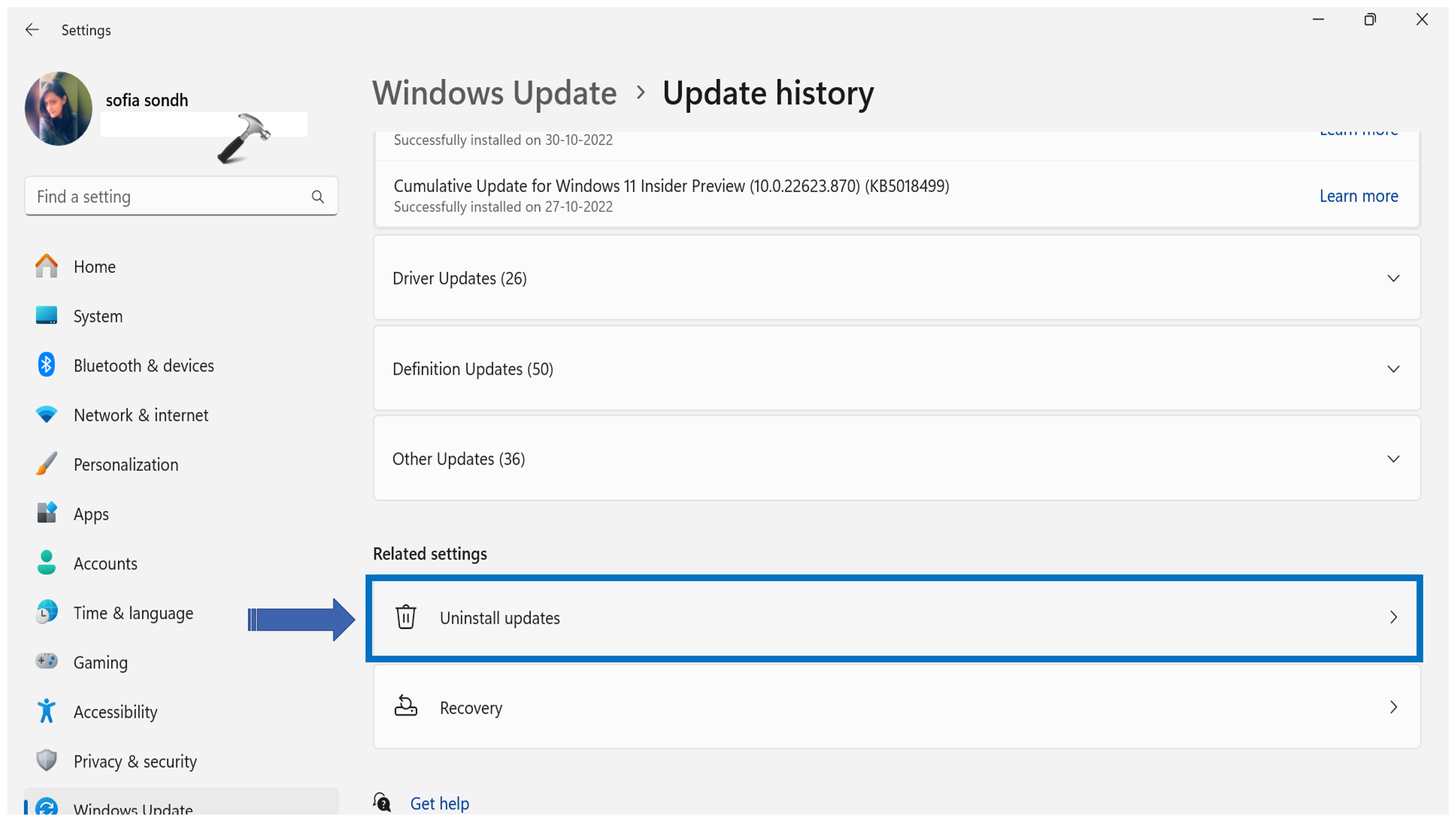 4. Listeden en son güncellemeyi kaldırın.