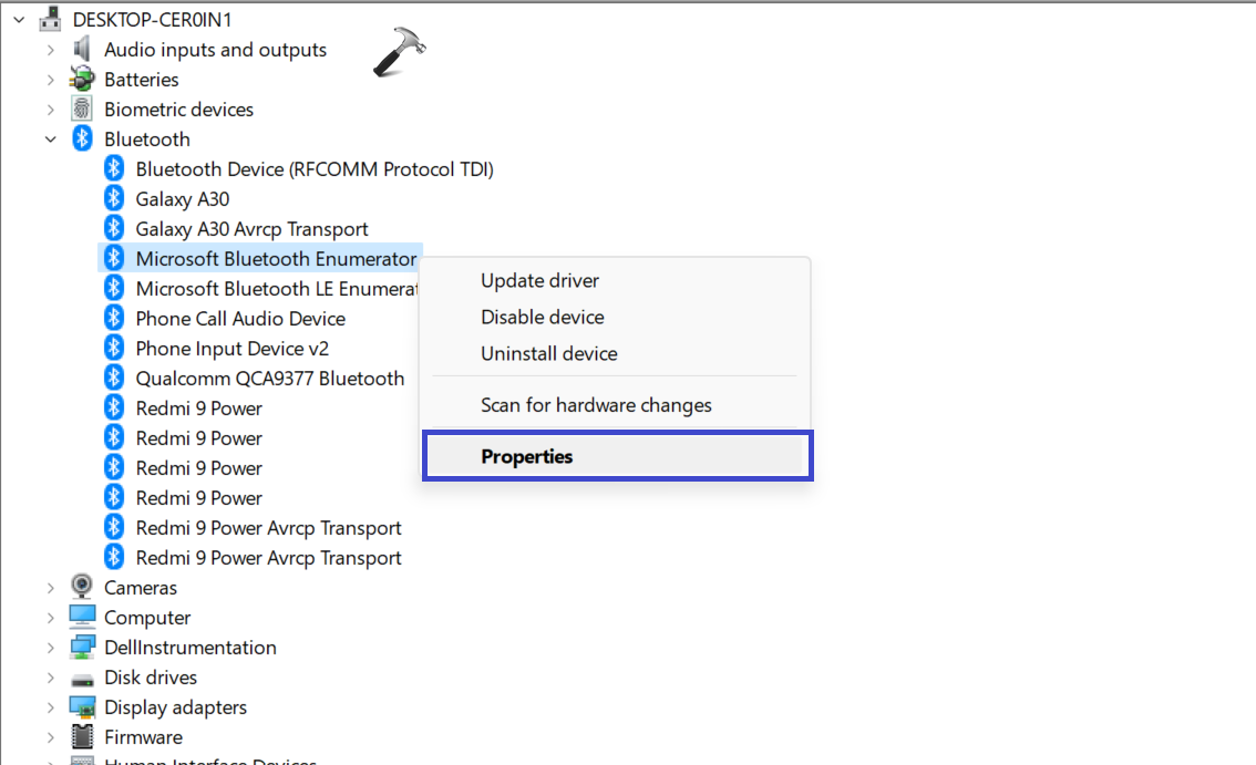 4.Detaylar"Sekmesi."Mülk”Seçeneği,"Bluetooth radyo düşük enerjili merkezi rolü destekler”Listeden seçeneği.
