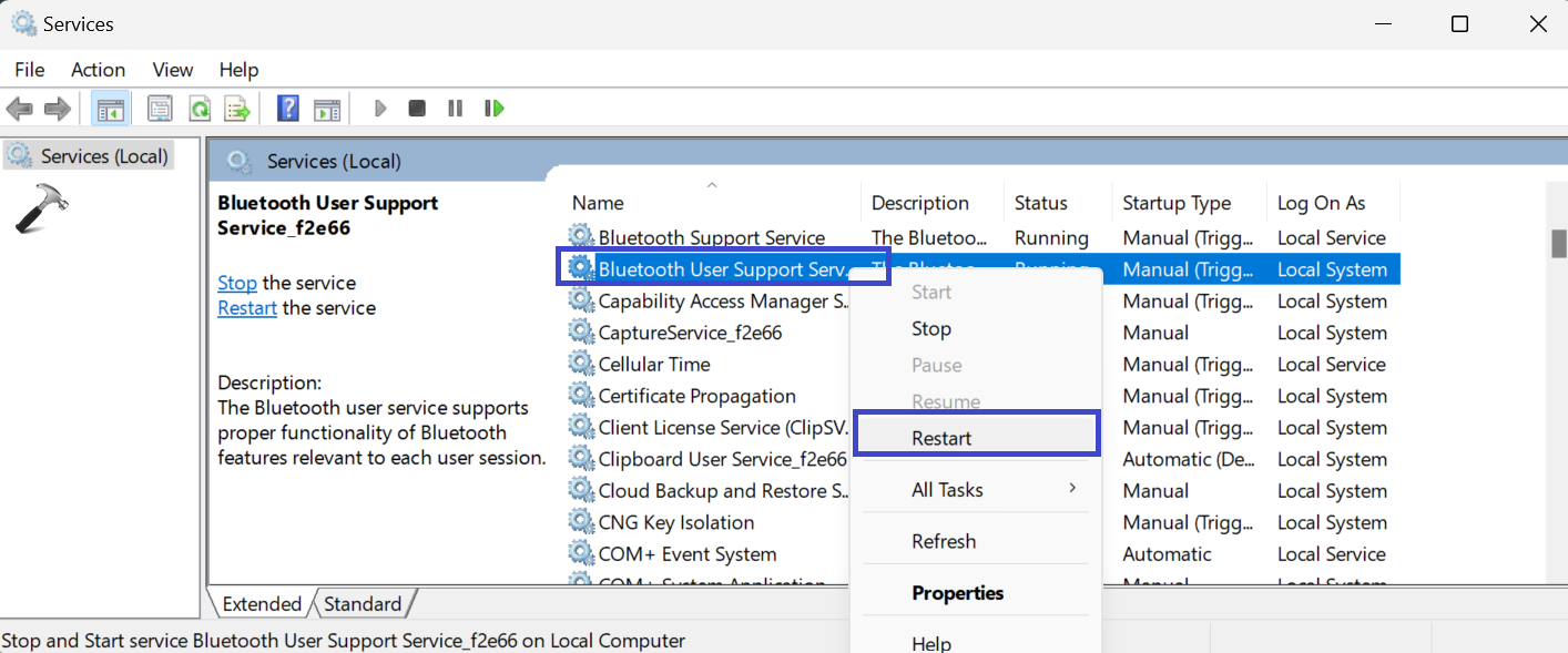 Not: Bluetooth destek hizmetini ve BluetoothuserService'i yeniden başlattıktan sonra PC'nizi birkaç kez yeniden başlatmanız gerekebilir.