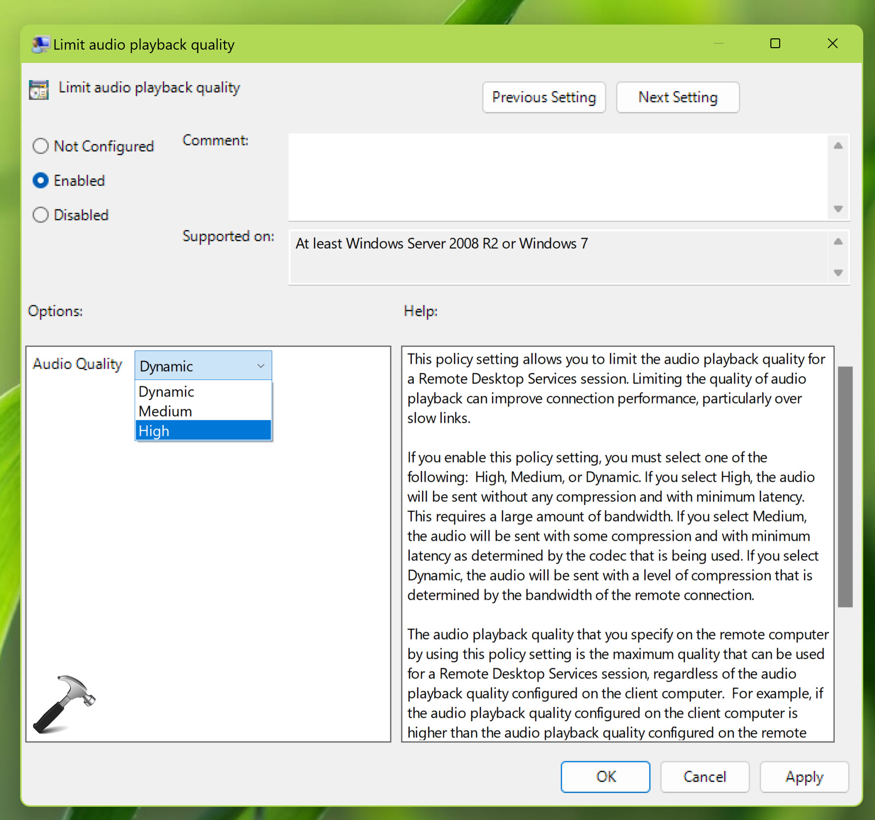 - Ayrıca setSes Oynatma Kalitesini Sınırlayınetkinleştirme politikası.