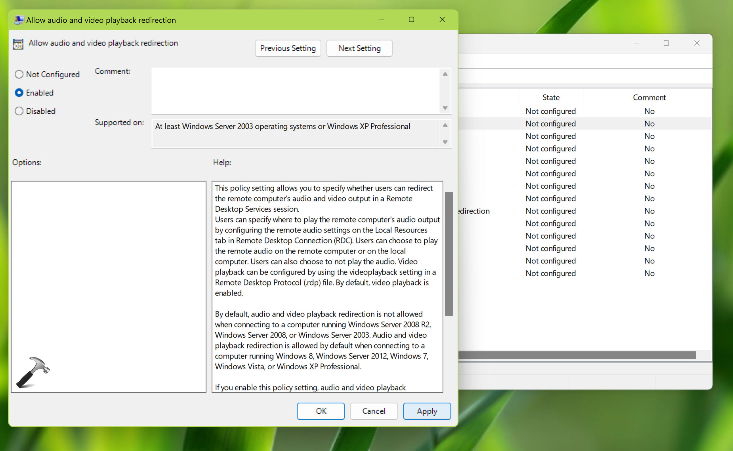 - Set adlı ilke ayarını bulunSes ve video oynatma yeniden yönlendirmesine izin verve etkin olarak ayarlayın.