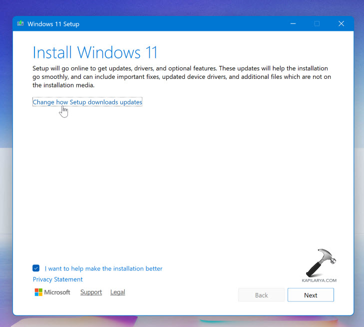 4. Windows 11 kurulum ekranında,Kurulum indirmelerinin güncellemelerini değiştirin.