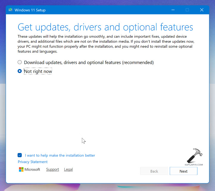 5. Bir sonraki ekranda seçinŞu anda değil. İsterseniz, seçeneği işaretleyebilirsinizKurulumu daha iyi hale getirmeye yardımcı olmak istiyorum.