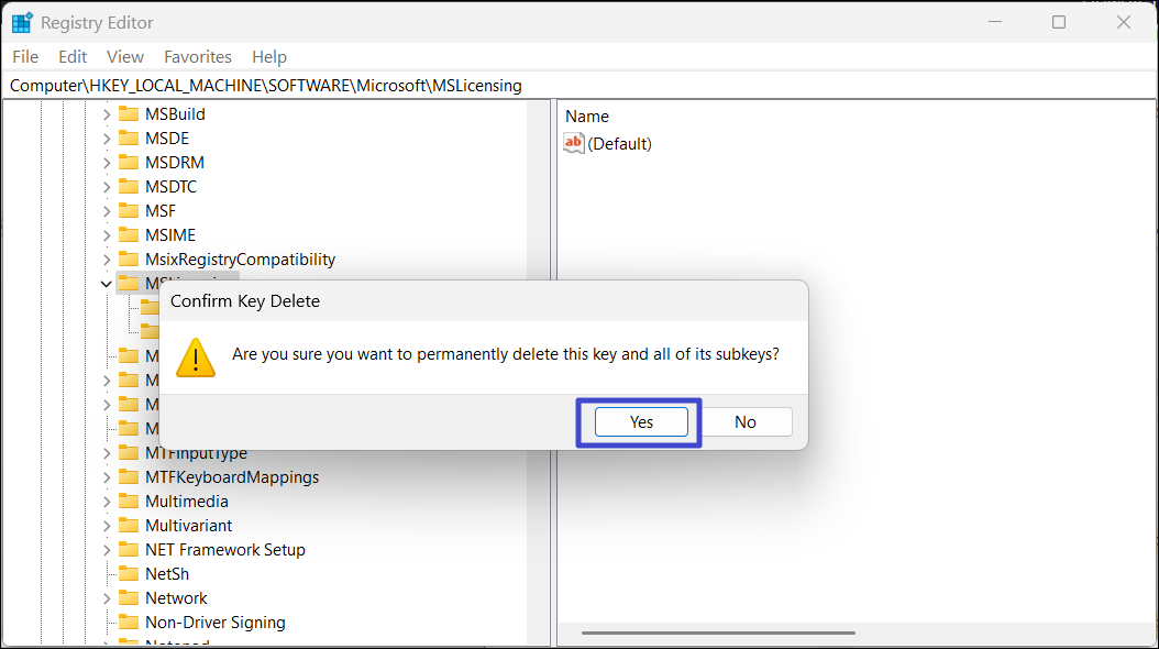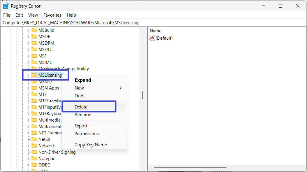 3. Microsoft anahtarının altında, “MS Lisanslama”Klasör. Ardından, seçin”Silmek".