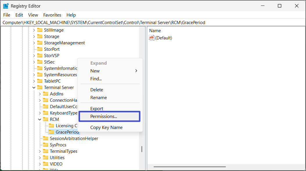 5. RCM klasörünün altında “Graceperiod”Anahtar. Bu anahtarı değiştirmeden önce, bunun sahipliğini almanız gerekir. Bunu yapmak için anahtarı sağ tıklayın ve seçin”İzin".