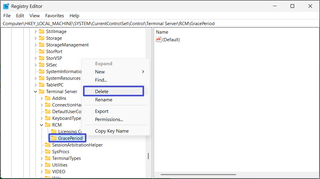 7. Tam kontrolü kazandıktan sonra, “Graceperiod ”ve seçin "Silmek“Bir yedekleme için anahtarı yeniden adlandırmayı da seçebilirsiniz.