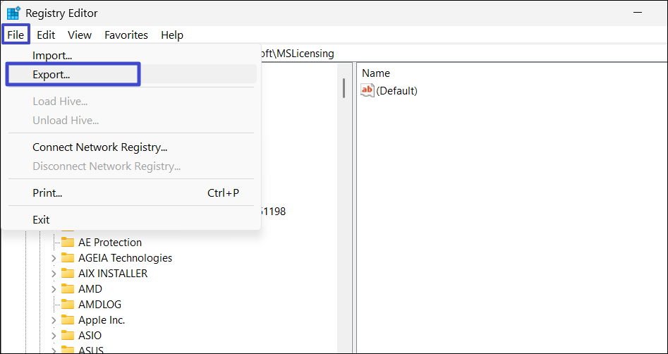 2. Kayıt defterinizi değiştirmeden önce yedeklemeniz önerilir. Bunu yapmak için “Dosya”Menü ve seçin"İhracat".