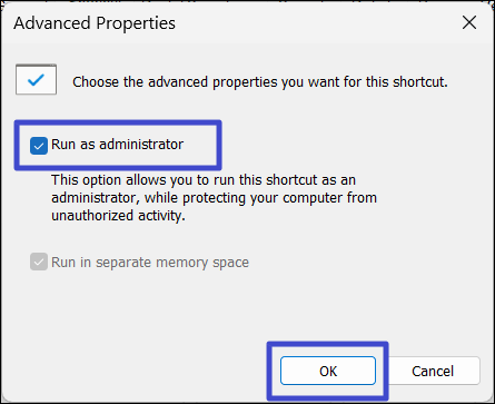 4. Gelişmiş Özellikler Kutusunda “Yönetici olarak çalıştır”Seçeneği ve tıklayınTAMAM".