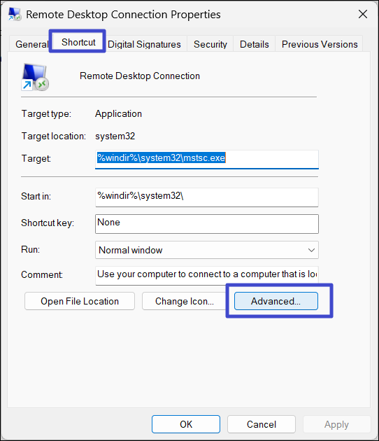 2..Uzak Masaüstü Bağlantısı"Kısayol ve seçin"Özellikler".