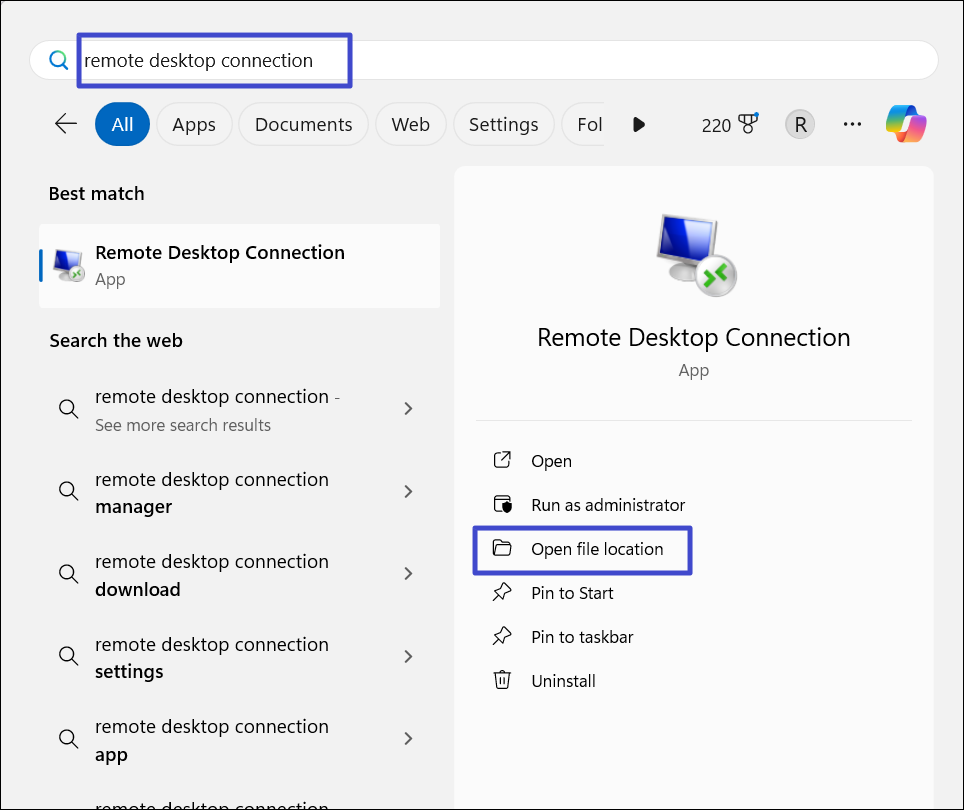1. Windows tuşuna basın ve yazınUzak Masaüstü Bağlantısı". Sonuçtan uygulamayı sağ tıklayın ve"Yönetici olarak çalıştır".