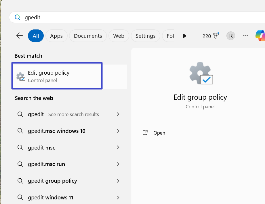 1. Başlangıç menüsünü açın, yazın “gpedit" veya "Grup Politika Editörü“Ve en iyi sonucu seçin.