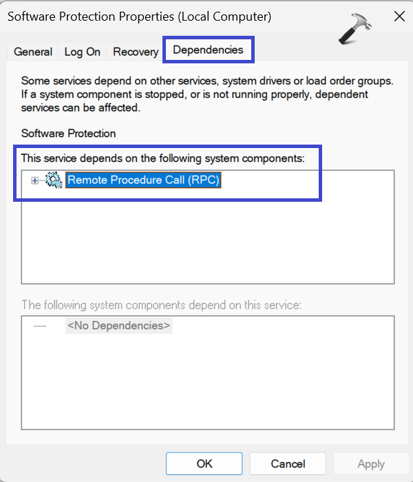 3. Bağımlılıklar sekmesi altında, “Uzak Prosedür Çağrısı (RPC)”Bağımlı hizmetleri RPC ile kontrol etmek için seçeneği.