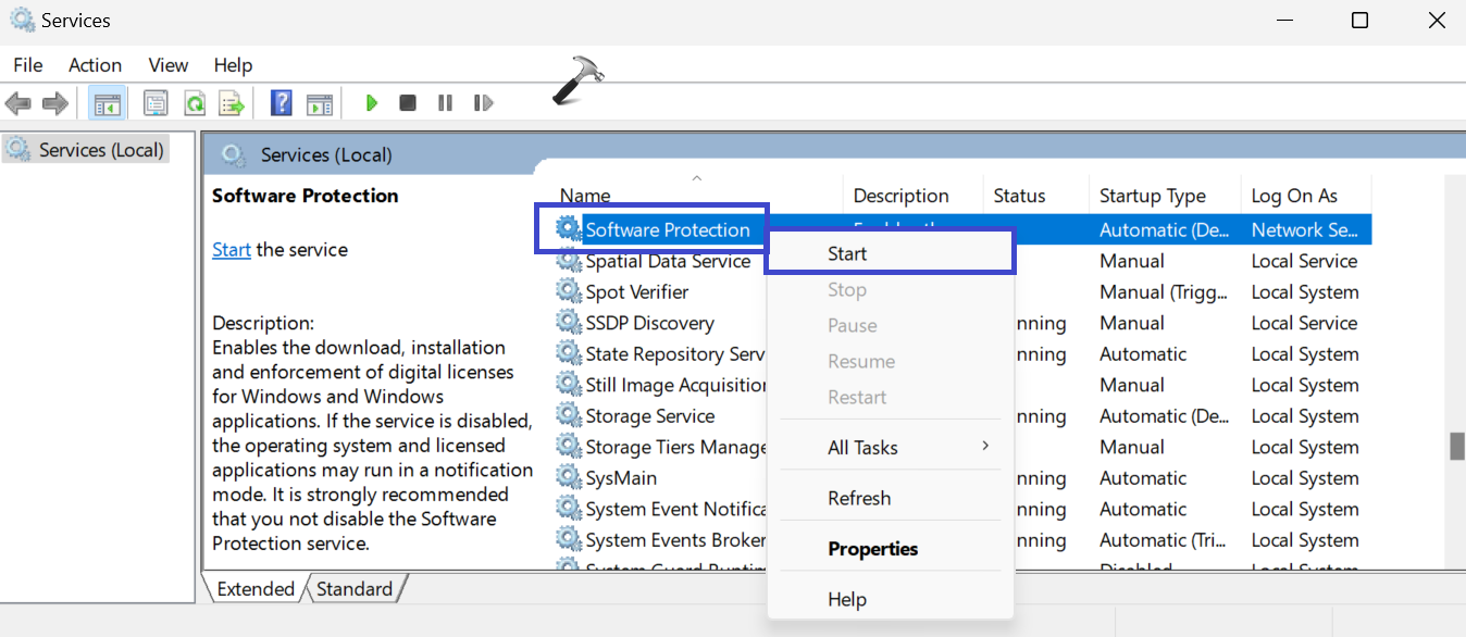 2.Yazılım koruması”Seçenek. Üzerine sağ tıklayın ve seçin”Başlangıç".