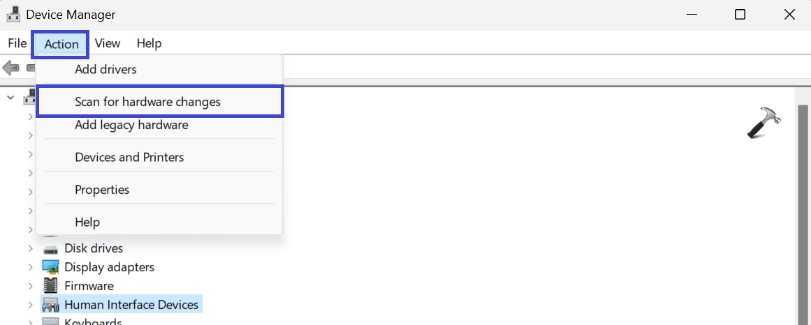 Bundan sonra, "Aksiyon”Sekmesi ve tıklayınDonanım değişiklikleri için tarama".
