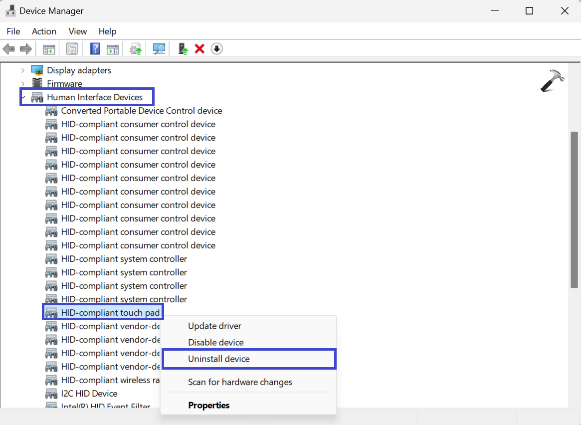 Dokunmatik yüzey sürücüsünü de yeniden yükleyebilirsiniz. Bunun için, dokunmatik yüzey sürücüsüne sağ tıklayın ve ardından “Kaldırmak".