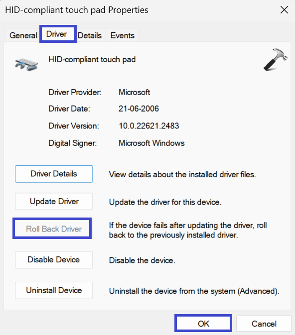 Bir sürücü güncellemesinden sonra Windows 11'de dokunmatik yüzey ayarlarının kaybolmasını yaşadıysanız, dokunmatik yüzey sürücüsünün önceki bir sürümüne geri dönmeyi düşünün.