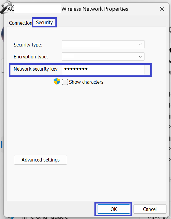 WiFi şifresini veyaAğ Güvenliği Anahtarı.Tamam'ı tıklayın.