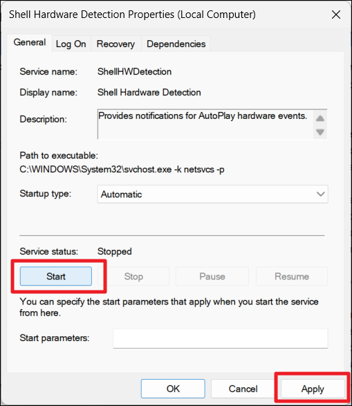4. Tıklayın “Başlangıç"Hizmet çalışmıyorsa ve"Uygula".