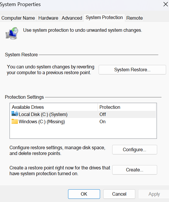 - Şimdi tıklayınSistem korumasıondanİlgili bağlantılarbölüm.