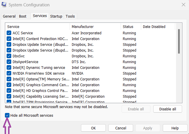 Ardından,HizmetSekme ve Kontrol EdinTüm Microsoft Hizmetlerini Gizleonay kutusu.