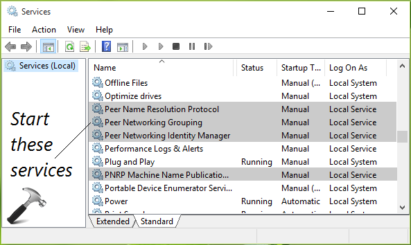 6.Snap-in açık hizmetleri. Adlandırılmış hizmetlerinAkran Adı Çözünürlük Protokolü-Akran Ağ Kimlik YöneticisiVePNRP Makine Adı Yayınkoşuyor. Koşmuyorlarsa, bunlara tek tek tıklayın ve tıklayınBaşlangıç. O zaman başlayabilirsinAkran ağ grubuhizmet ve beklendiği gibi çalışmalıdır.