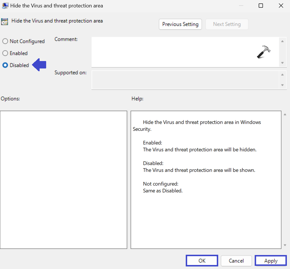 Windows güvenliğinde virüs ve tehdit korumasını göstermek için “yapılandırılmamış” veya devre dışı seçin.