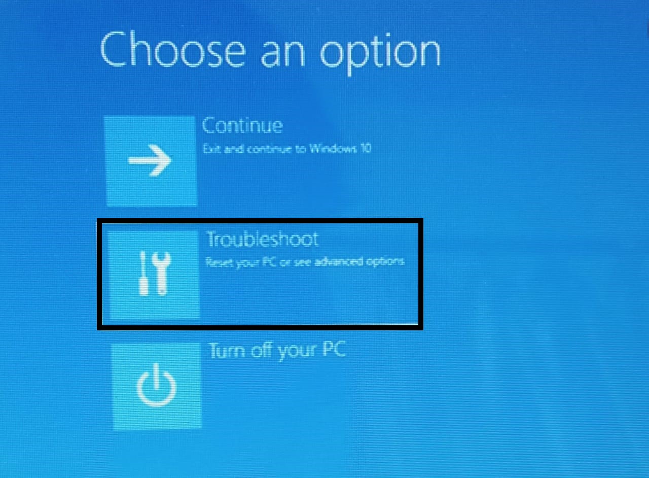 3. Windows kimliği tekrar başladıktan sonra seçinSorun gidermekBir seçenek ekranı seç.