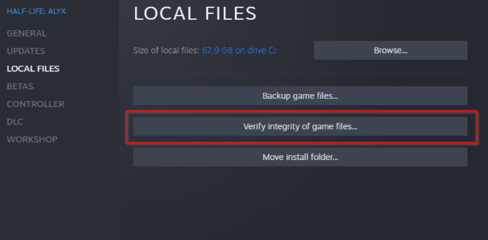 3. Adım:SeçmeYerel dosyalarsol menüden ve ardından seçinOyun dosyalarının bütünlüğünü doğrulayın.