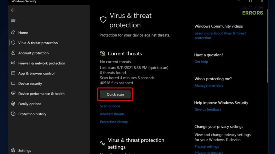 4. Görene kadar aşağı kaydırınMevcut tehditlerSeçenek, ardından hızlı bir tarama yapmayı seçin.