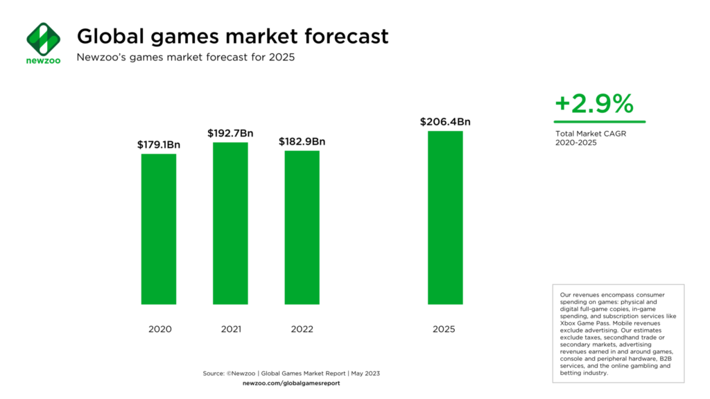 Küresel Oyun Pazarı%-5.1'lik küçük bir isabet almasına rağmen, 2022'de ilerlemek,Newzoo'ya göre, 182.9 milyar dolar değerinde olduğu ve film ve müzik endüstrisinin bir araya geldiği geliri bir kez daha aştığı için TV endüstrisinden sonra hala ikinci en büyük eğlence endüstrisi oldu.