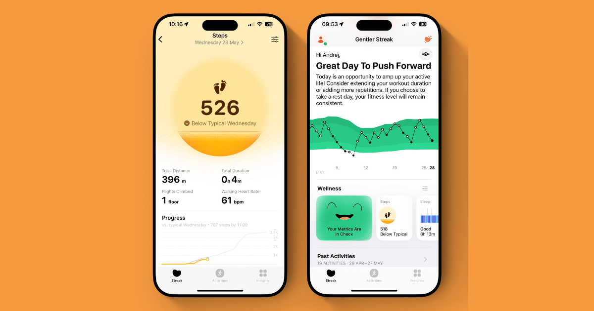 Günlük adım sayısı ince ama önemli bir ektir. Sizi keyfi hedefleri kovalamaya itmek yerine, daha nazik Streak, adımları daha büyük resmin bir parçası olarak ele alır: vücudunuz nasıl hareket eder, iyileşir ve uyarlanır. Güncelleme sadece ham sayıları gösterge panelinize dökmez. Adım sayısınızı mesafe, yürüyüş süresi, kalp atış hızı ve uçuşlar ile birlikte gösterir ve aktivitenizi geçmiş eğilimlerle, bunları takıntılı değil, kalıpları anlamanıza yardımcı olacak şekilde karşılaştırır. İki haftalık takvim, baskı olmadan hareketi yansıtmak için önceki günlerde geri dönmenizi sağlar.