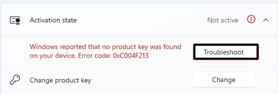 2.Şimdi tıklayınAktivasyon durumubölümü genişletmek veSorun gidermekYanında Seçenek"Windows, cihazınızda hiçbir ürün anahtarı bulunmadığını bildirdi. Hata kodu: 0xc004f213"