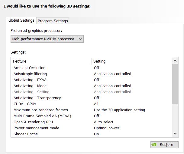 - SeçinGlobal AyarlarSekme ve SeçinYüksek performanslı Nvidia işlemcisiTercih edilen grafik işlemci açılır menüsünden.