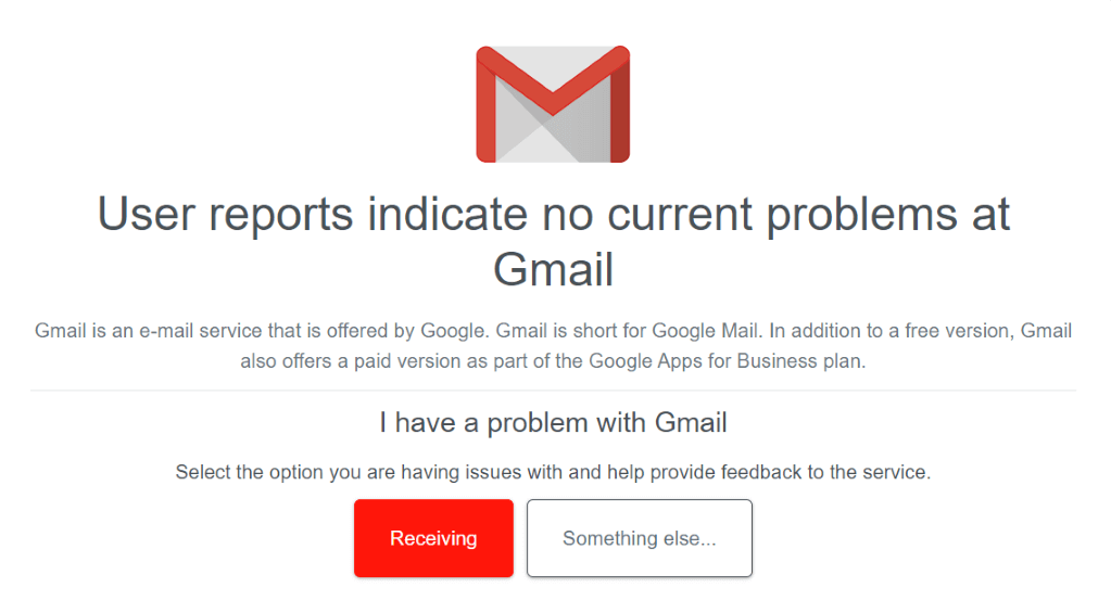 Sunucuların ziyaret ederek kapalı olup olmadığını kontrol edebilirsinizDowndetector sitesindeki Gmail'in sayfası. Bu site, bir çevrimiçi hizmetin sorun yaşayıp yaşamadığını söyler