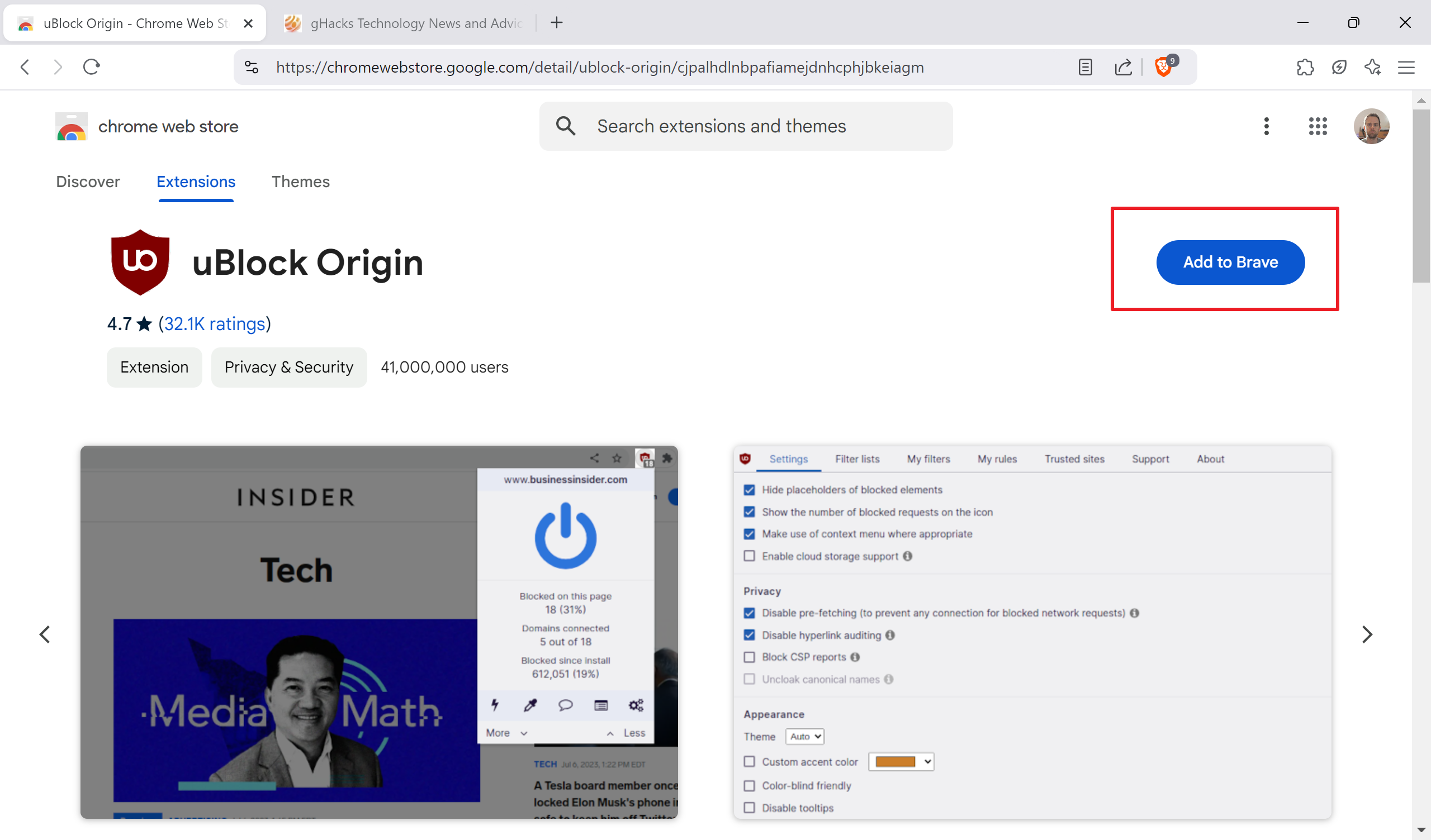 Başka bir tarayıcıdaki Ublock Origin Mağazası sayfasını ziyaret ettiğinizde, uzantının hala mevcut olduğunu fark edeceksiniz. Brave, Vivaldi, Edge veya Opera kullanıyorsanız, bu tarayıcıya yükleme seçeneğini alacaksınız.