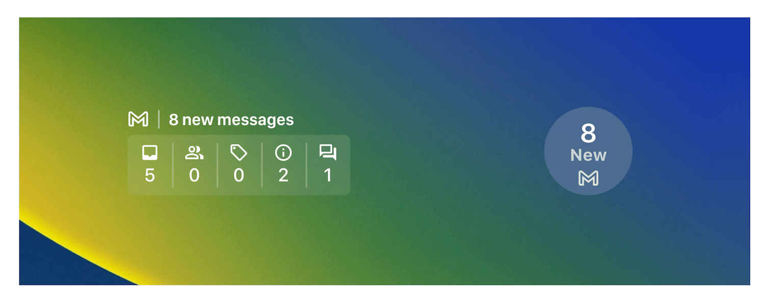- Gmail'in Kilit Ekranı WidgetEn son e -postaları görüntüler ve gelen kutusundaki yeni mesaj sayısını otomatik olarak günceller. Ayrıca güncellemeler veya sosyal gibi gelen kutusu kategorilerini göstermek için özelleştirilebilir.