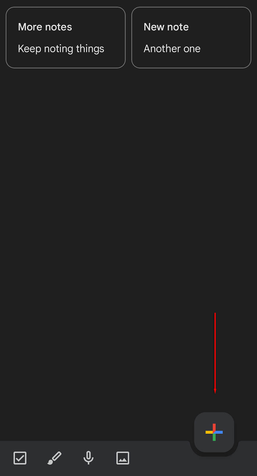 Google, mobil uygulamadaki notları saklayın Bir tür ön sayfada görünür ve en yeni not sol üst köşede görünür. “+”Sağ alt köşedeki sembol. Ekranın altındaki karşılık gelen simgeyi seçerek başka medya formları da ekleyebilirsiniz.