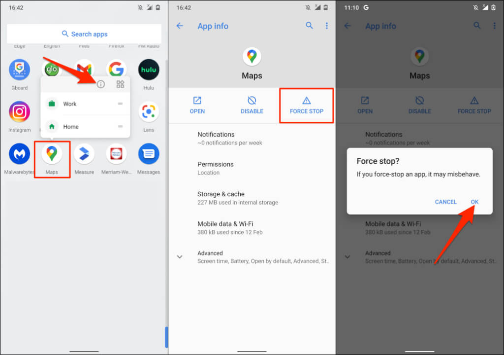 Bir Android uygulamasını kapatma kuvveti bazı işlevlerini geri yükleyebilir. Sesli gezinme veya diğer özellikler Google Haritalar'da çalışmıyorsa, uygulamayı zorla kapatın ve tekrar kontrol edin.