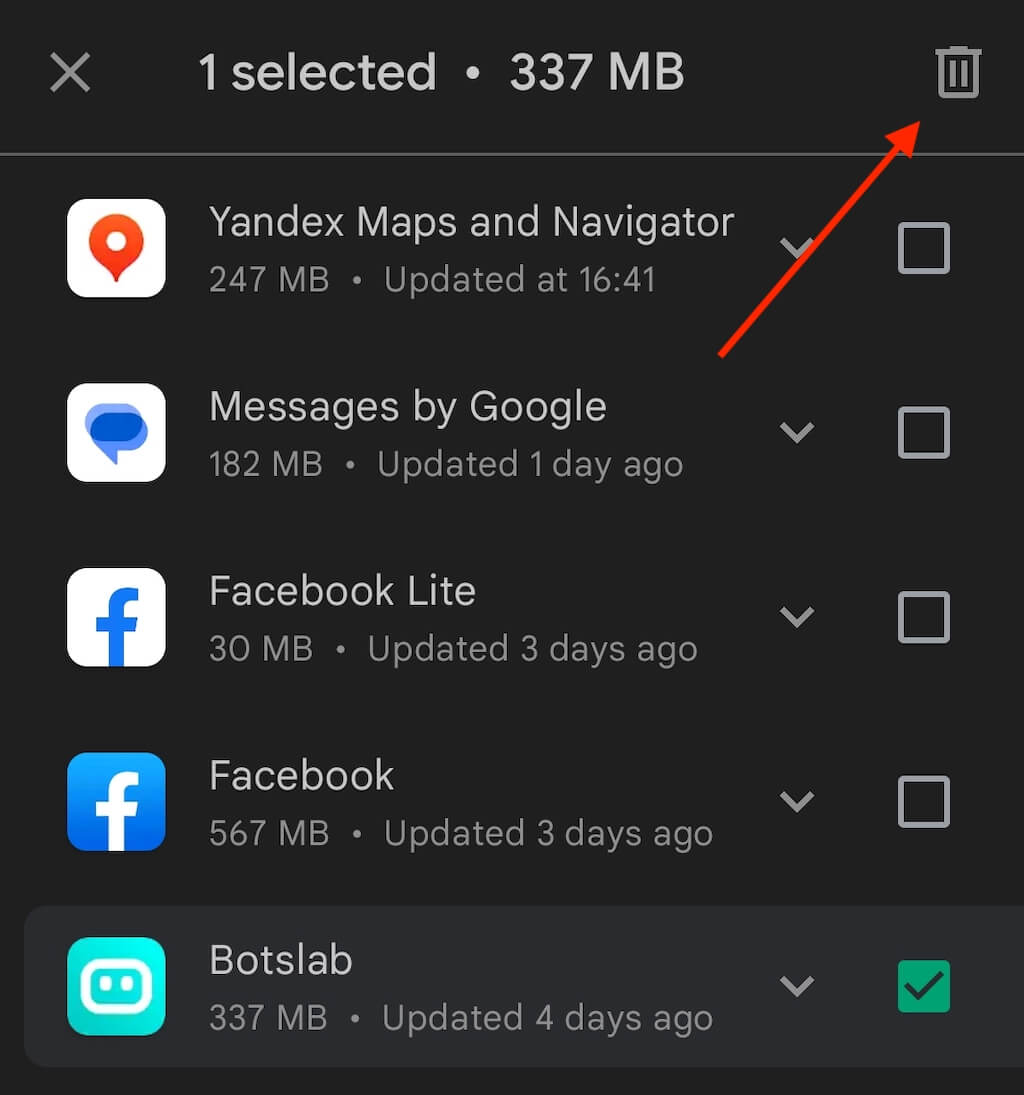 - Telefonunuza yeniden yüklemeniz ve seçmeniz gereken uygulamayı bulun. SeçmeKaldırmakveyaçöp kutusu simgesi.