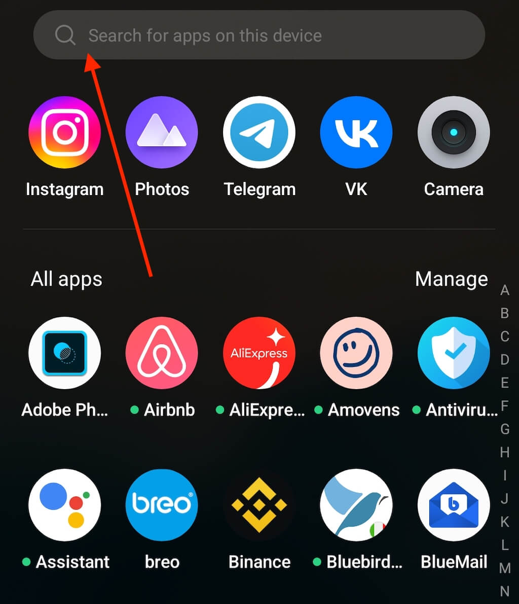 - Ana ekranınıza eklemek istediğiniz uygulamayı bulun. Uygulama çekmecesinde gezinebilir veya kullanabilirsiniz.arama çubuğuUygulamanızı bulmak için ekranın üstünde.