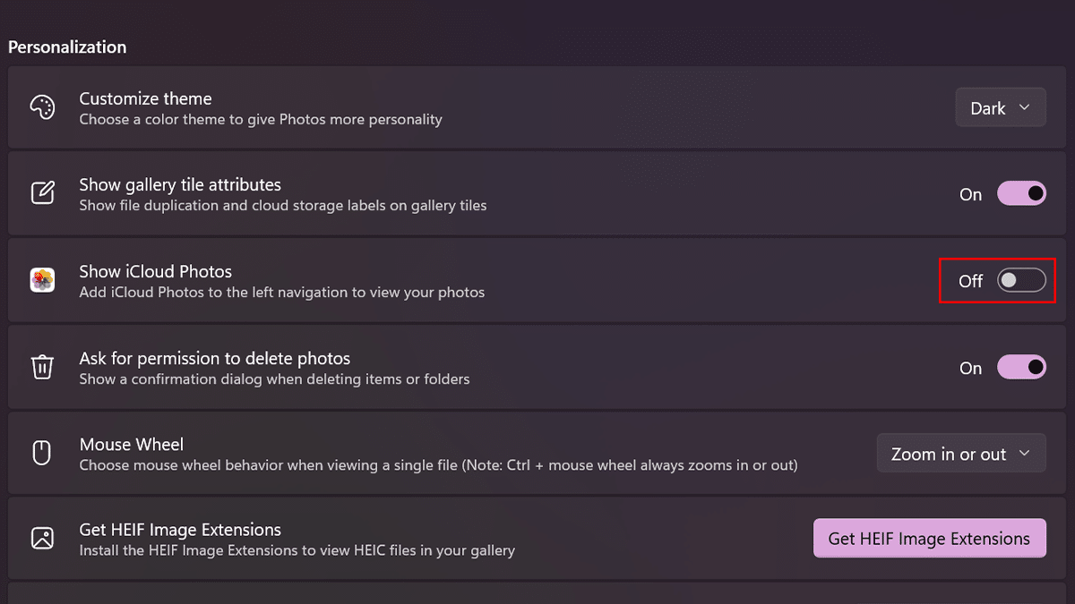 - "Kişiselleştirme”Bölüm>"Icloud fotoğraflarını göster" anahtar.