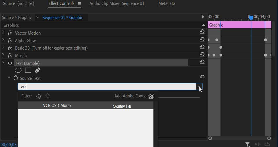 - KullanırkenTemel grafiklerpanel şablonlar, içine girEtki kontrolleripanel. AçMetinAçılır, o zamanKaynak metinyıkılmak. Yazı tipini değiştirmek için hemen altındaki kutuyu tıklayın.