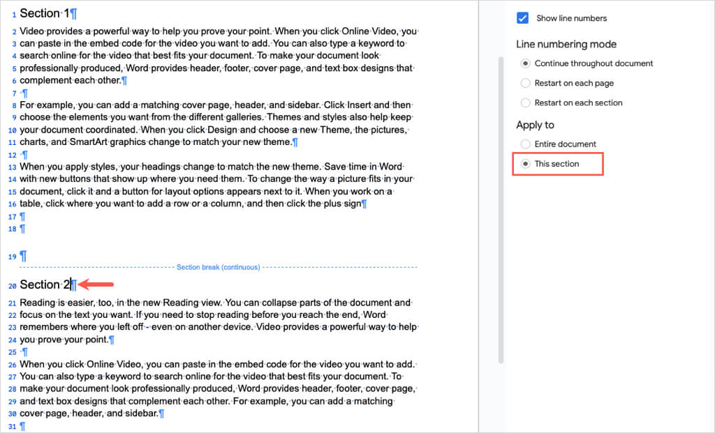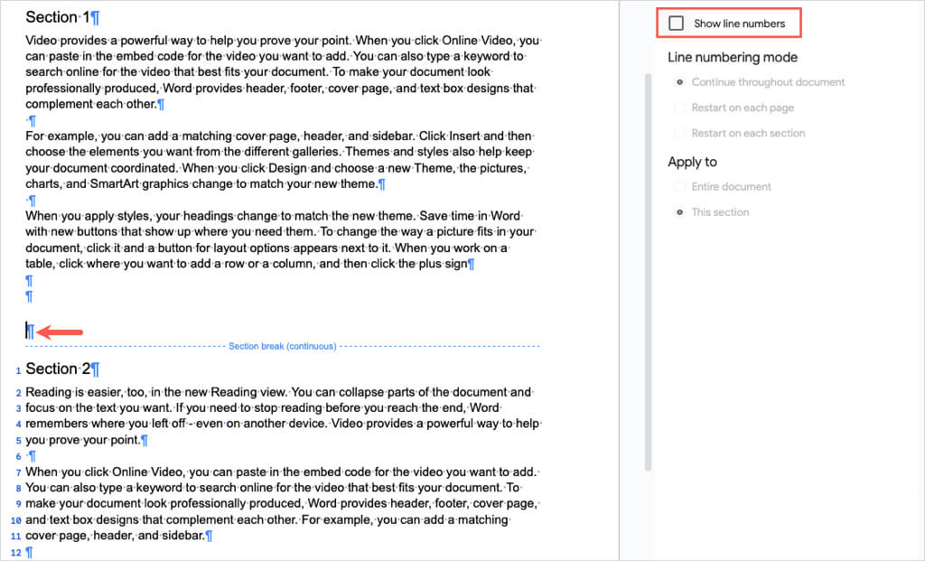 Belgenin tamamı yerine yalnızca belirli bölümlerde satırları numaralamak istediğiniz bir belgeniz varsa, bu bölümleri ekleyerek başlayacaksınız.