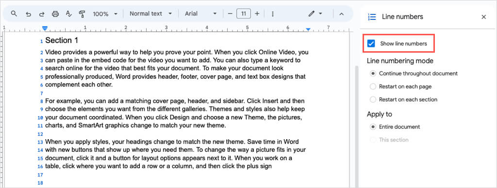 - Kenar çubuğu sağda açıldığında, üstteki kutuyu kontrol edinSatır numaralarını göster.