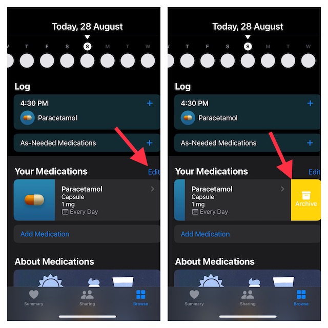 Herhangi bir ilacı çıkarmak istiyorsanız, ekranın sağ kenarından sola kaydırın ve Arşiv düğmesine basın. Alternatif olarak, Düzenle düğmesine dokunun ve ardından bir ilacın solundaki küçük arşiv düğmesine basın.