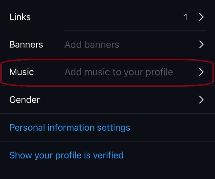 - Yeniyi bulana kadar seçeneklerde aşağı kaydırınMüzikbölüm. Profilinize bir şarkı ekleyeceğiniz yer burası.
