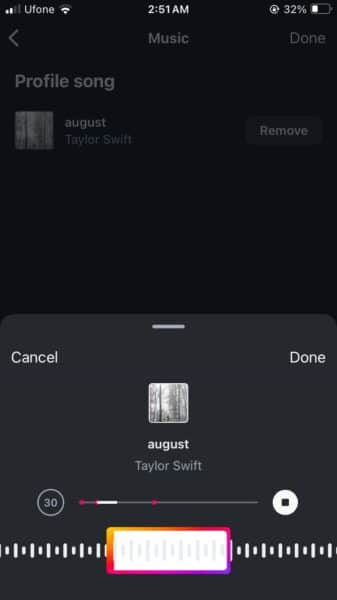 - İstediğiniz şarkıyı seçtikten sonra, parçanın 30 saniyelik bir bölümünü seçme seçeneğine sahip olacaksınız. Şarkının tarzınızı en iyi temsil eden bölümünü seçmek için kaydırıcıyı kullanın.