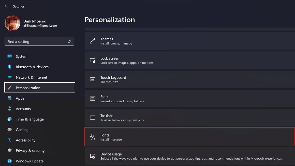 - AçıkAyarlar> Ona TıklayınKişiselleştirme> Aşağı kaydırın>Yazı tipleri.